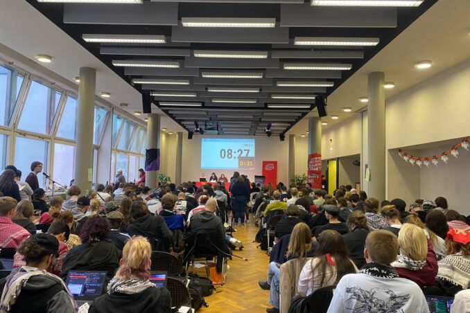 Insbesondere beim Thema Palästinasolidarität war offensichtlich, dass es eine merkliche Linksverschiebung gegeben hat. So wurde der Antrag A12 mit dem Titel “Nie wieder zu einem Völkermord schweigen” mit großer Mehrheit angenommen, während alle Änderungsanträge, die eine Abschwächung des Ursprungsantrages bedeutet hätten, abgelehnt wurden. Im Antrag wurde unter anderem festgehalten, dass der Jugendverband in der Vergangenheit versagt hat, die Verbrechen des israelischen Staates gegenüber den Palästinenser*innen klar zu benennen. Gleichzeitig wurden diese Verbrechen als fester Bestandteil der imperialistischen Politik des Westens und Israels benannt. Im Antrag wird daraus die Schlussfolgerung gezogen, dass “auch die Befreiung Palästinas als Teil einer breiteren demokratischen und sozialistischen Revolution betrachtet werden [muss], die den Imperialismus aus der Region herauswirft.”.