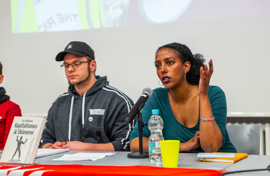 Nach einer Pause ging es weiter mit drei neuen Workshops. Einerseits mit der Buchvorstellung: „Kapitalismus und Sklaverei“. Mit Bafta Sarbo und René Arnsburg wurde die erste deutsche Übersetzung des Klassikers von Eric Williams vorgestellt. Diskutiert wurde, warum ohne koloniale Sklaverei der britische Kapitalismus nicht denkbar gewesen wäre, warum Rassismus nicht Ursache, sondern Folge ökonomischer Interessen war, und welche Bedeutung diese historische Analyse für heutige Kämpfe gegen Rassismus und Ausbeutung hat.