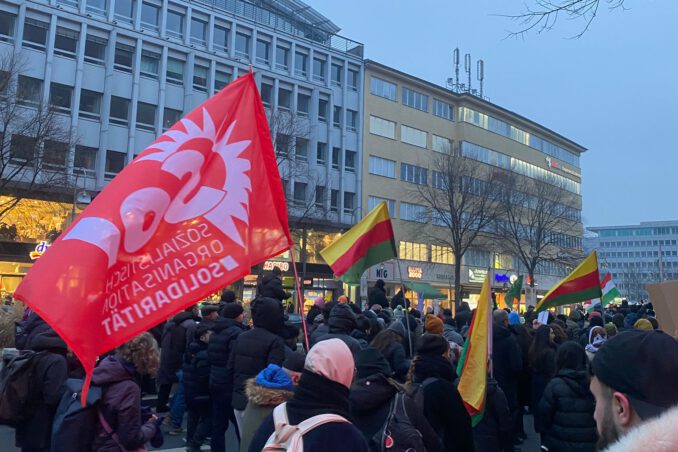 Zehntausende demonstrierten im Januar und international in Solidarität mit Rojava, das viele Linke als ein Symbol eines sozialen, antipatriarchalen und selbstverwalteten Gesellschaftsentwurfs betrachten. Auch die Sol ist solidarisch mit den Menschen in Rojava, deren Existenz und deren Rechte durch die neuen rechts-islamistischen Machthaber um den ehemaligen Al-Qaida-Mann Ahmed al-Scharaa bedroht ist. Wir fordern insbesondere die Gewerkschaften und die Partei Die Linke auf, Solidaritätsaktionen zu organisieren und Druck auf die Bundesregierung auszuüben, damit diese ihre faktische Komplizenschaft mit al-Scharaa beendet. Das Schicksal der Kurdinnen und Kurden muss von ihnen selbst bestimmt werden – nicht nur in den syrischen Gebieten Kurdistans, sondern auch in den Gebieten in der Türkei, dem Irak und dem Iran, wo tausende Kurd*innen bei der Niederschlagung der Massenproteste vor wenigen Wochen durch das Regime umgebracht wurden.